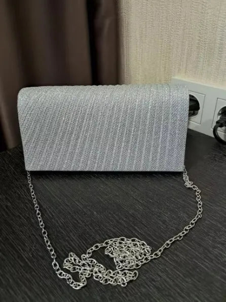 Shiny silver with glittering details. Our Glam Silver Evening Clutch is designed to enhance your elegance. Its sleek envelope design is complemented by a detachable chain strap, offering versatility. Perfect for weddings, parties, or any formal event. It holds all your essentials with style and grace. Make an unforgettable statement wherever you go.